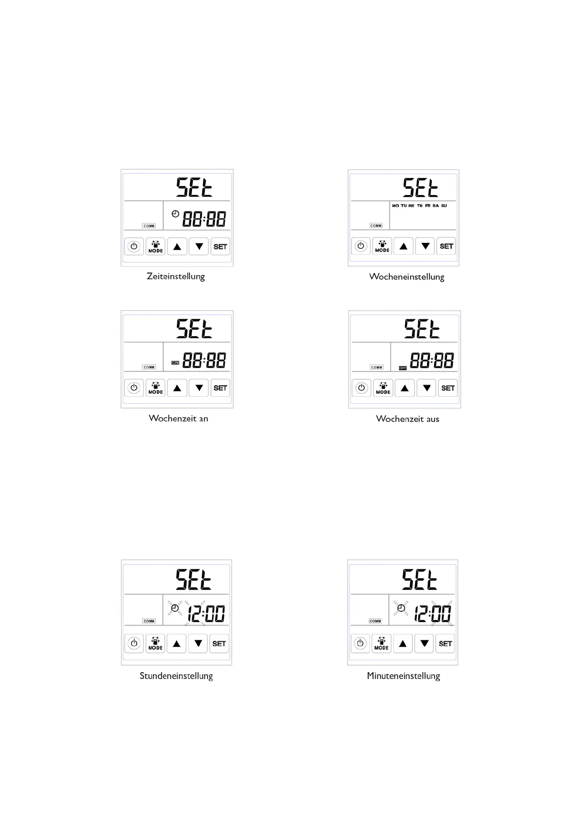 vorgenommen werden: Zeiteinstellung, Tageinstellung, Wochenzeit An und Wochenzeit Aus.
