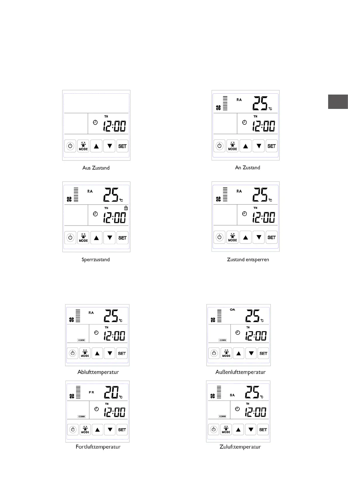 2. Modusschalter: drücken Sie die MODE-Taste um die Ab-Außen-Fort- sowie Zuluftluft-Einstellung, den