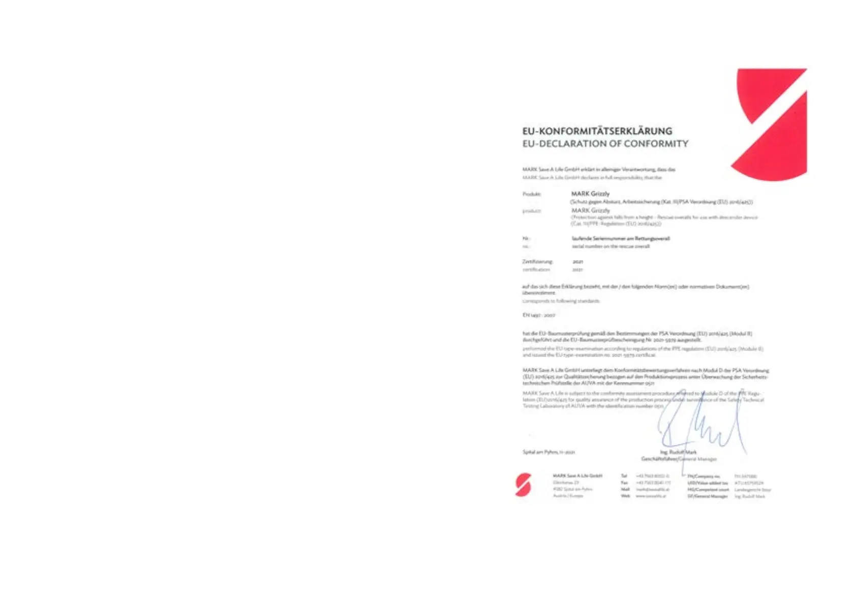 The manufacturer, MARK Save A Life GmbH, Gleinkerau 23, 4582 Spital am Pyhrn,