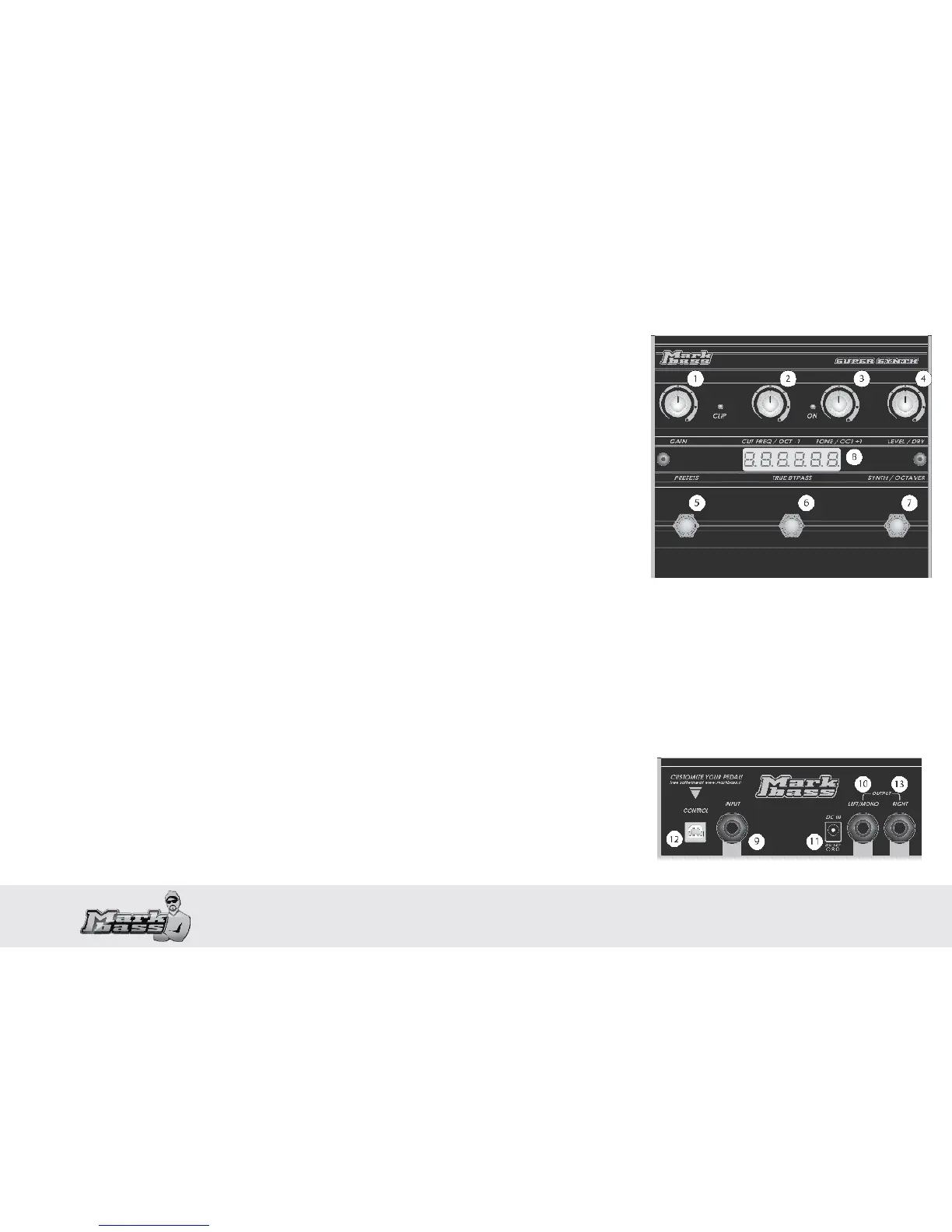 True Bypass Switch (6)* - Toggles between “on” and bypass mode. The LED illuminates when the synth/octaver eect is active.