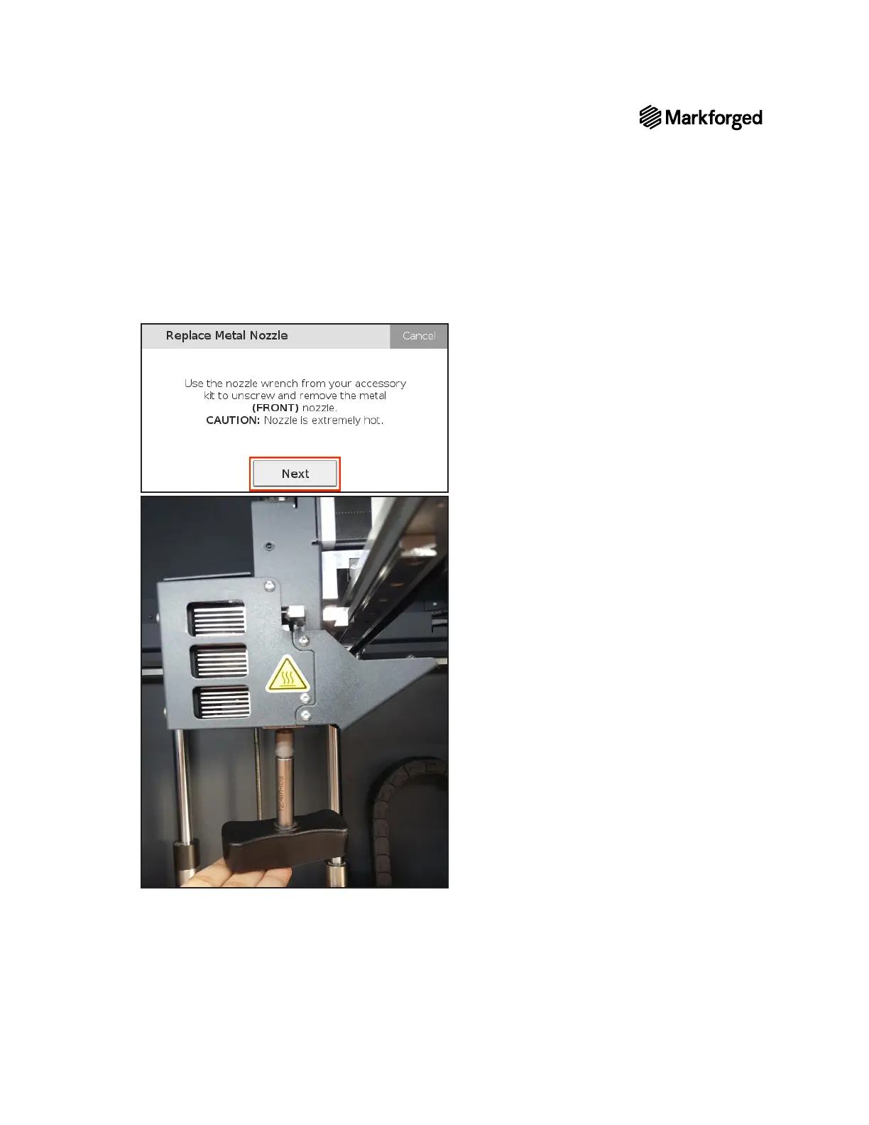 9. Using the included nozzle wrench, unscrew the metal nozzle. Note that the metal nozzle is the one closest