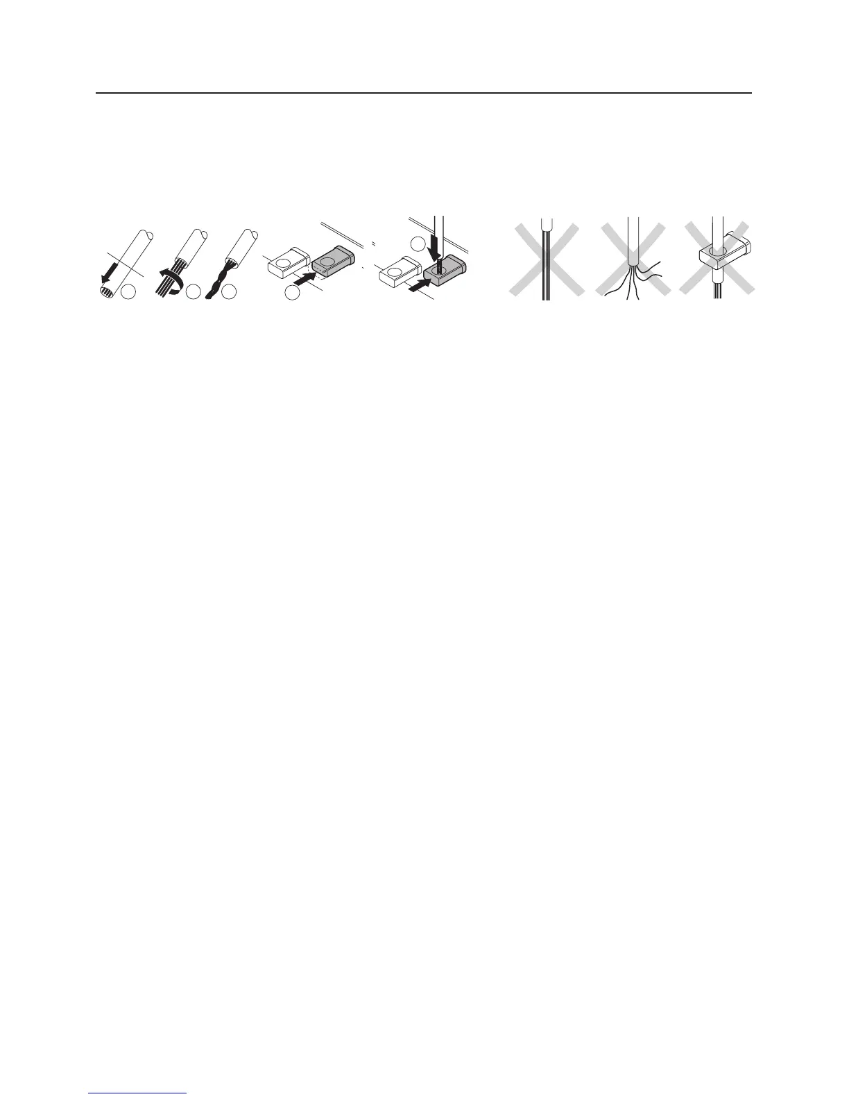 Strip 5-8 mm / approx. 1/8” of insulation from the ends of the wires, twist the