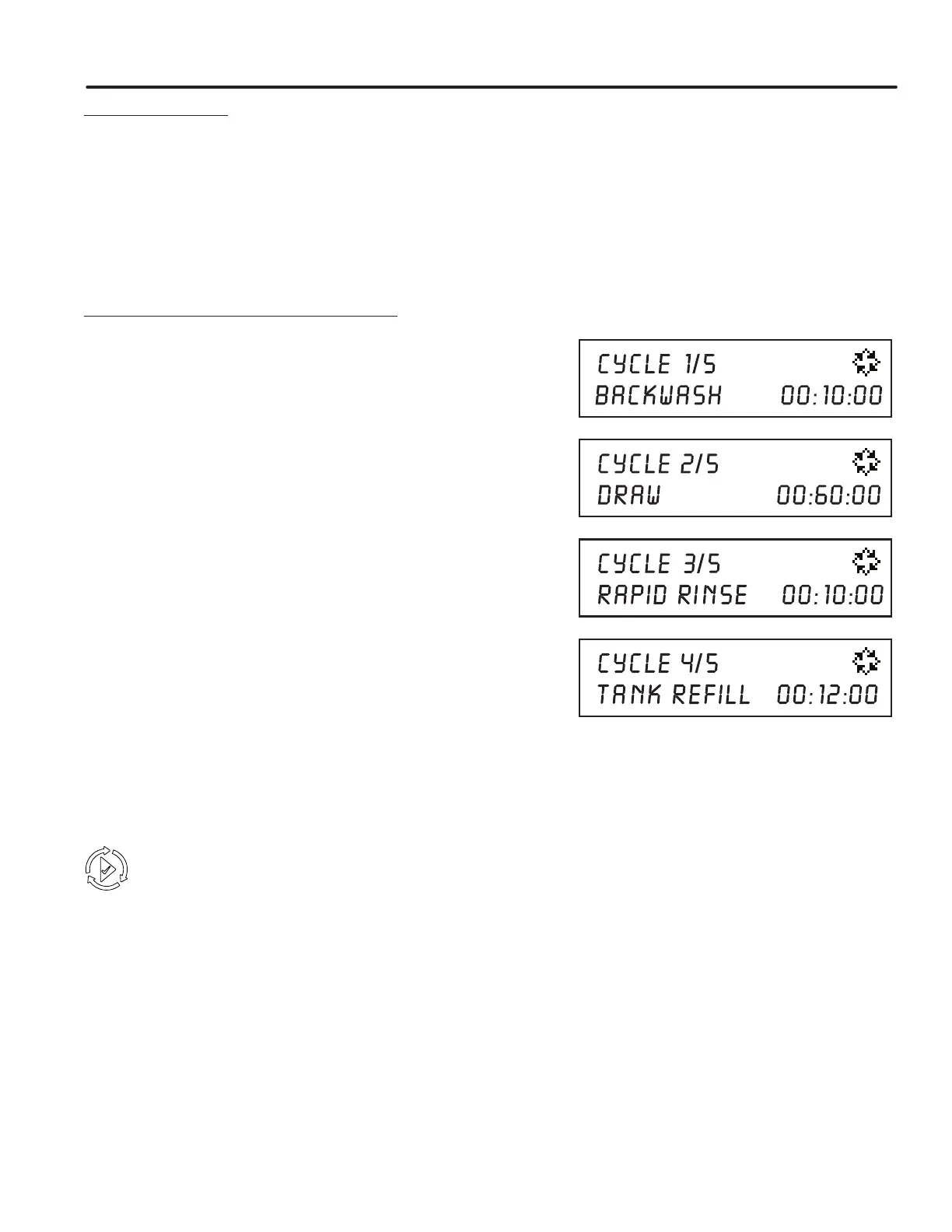 In the Regeneration Cycle step display, the timer shows the current regeneration cycle name the valve is in, or has