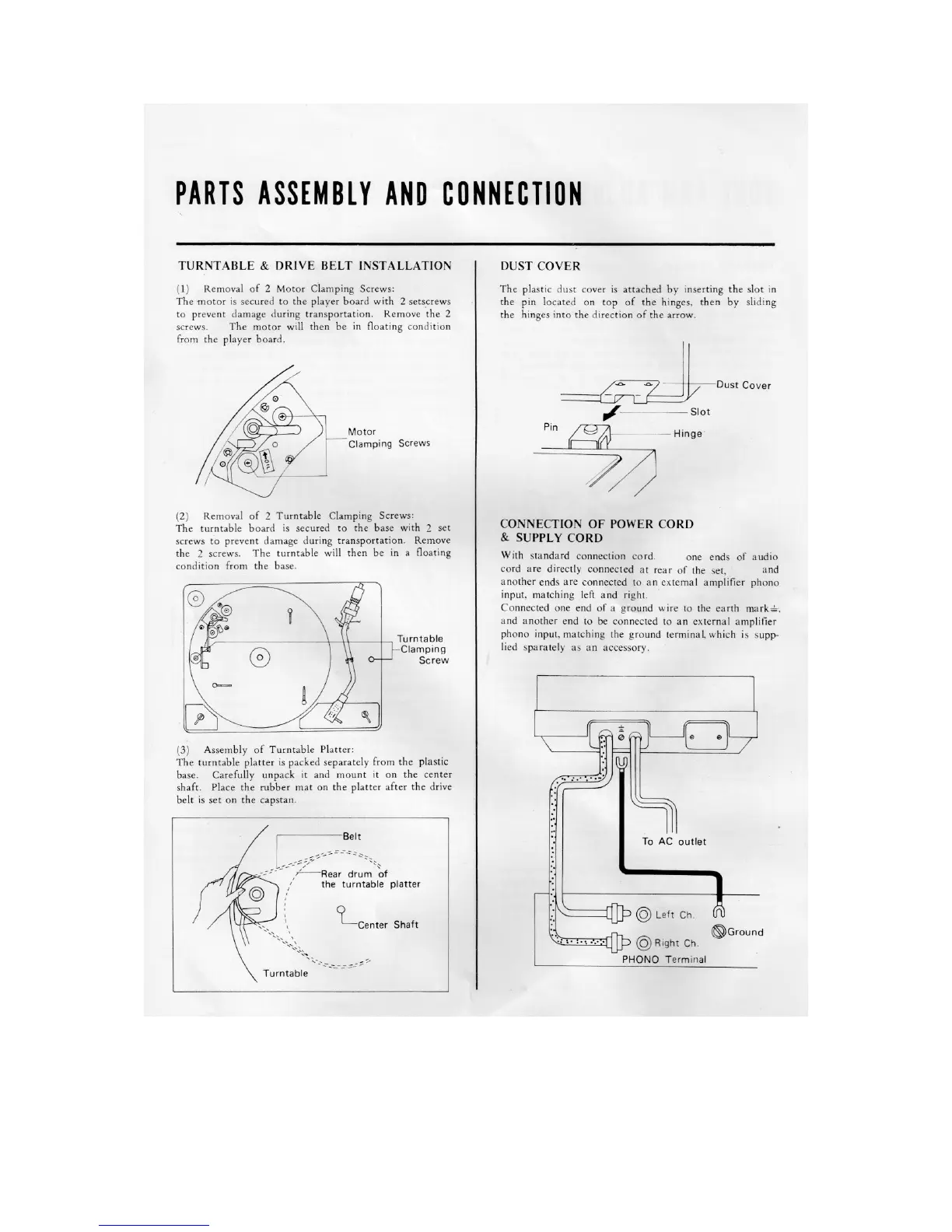 Marlux MX-146 - Parts Assembly and Connection; Turntable & Drive Belt Installation; Dust Cover; Connection of Power Cord & Supply Cord