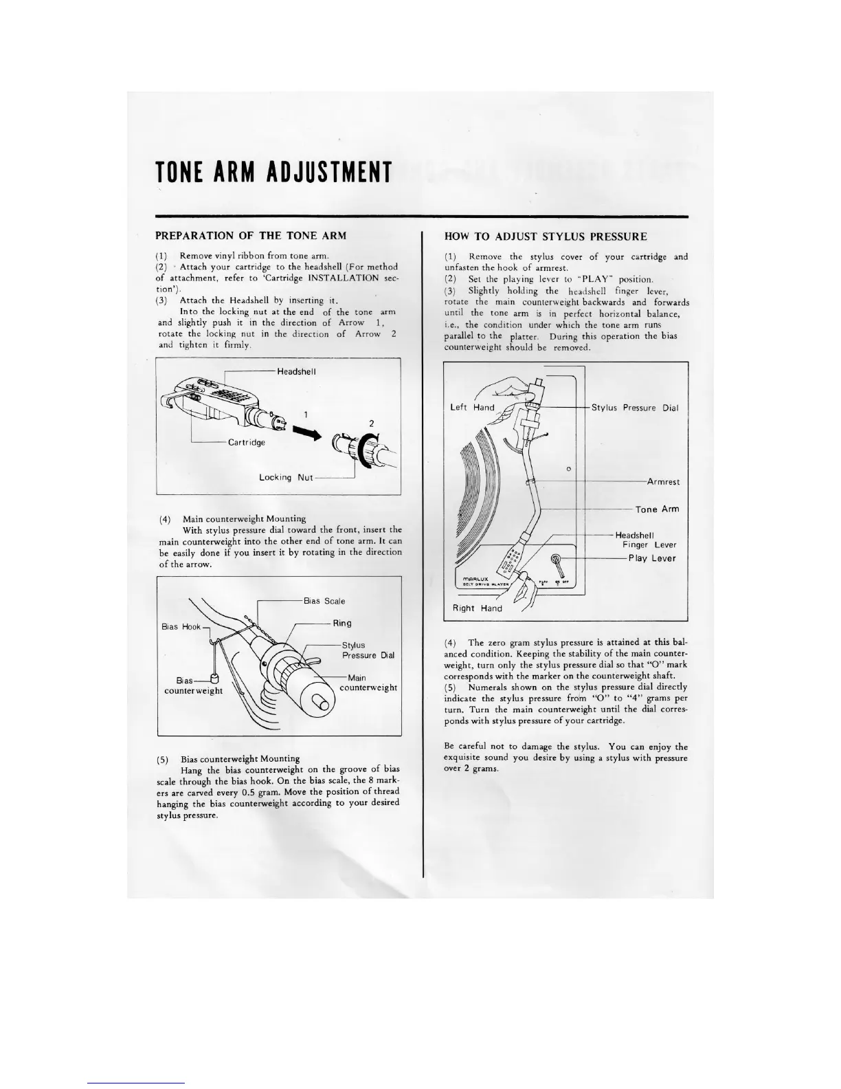 Marlux MX-146 - Tone Arm Adjustment; Preparation of the Tone Arm; How to Adjust Stylus Pressure; Bias Counterweight Mounting