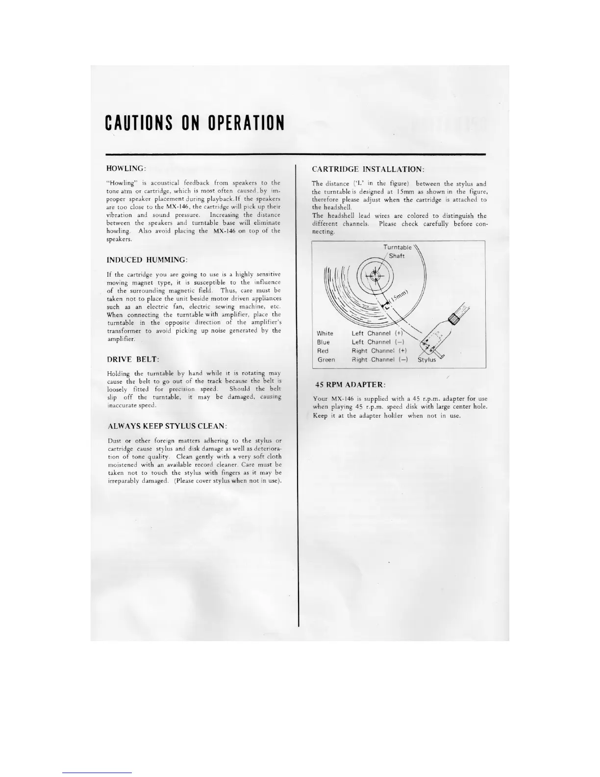 Marlux MX-146 - Cautions on Operation; Howling; Induced Humming; Cartridge Installation
