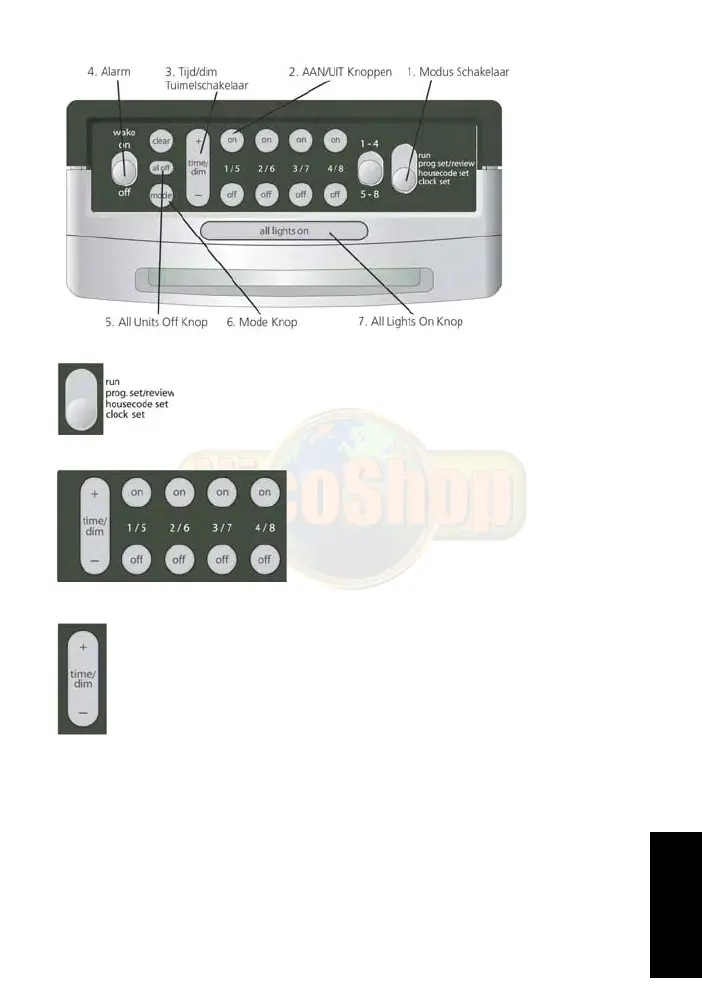 6. Mode Knop maakt de keuze tussen dagelijks, éénmalig en bewakingsmodus.