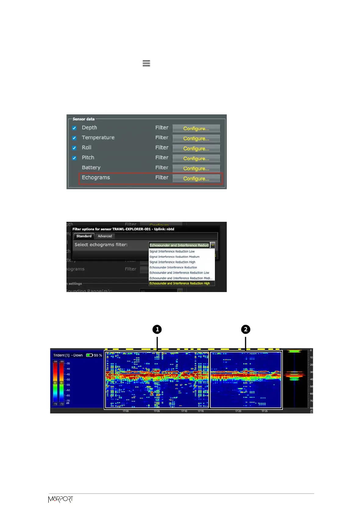 1. Noisy echogram with default filter ( Echosounder and Interference Reduction Low)