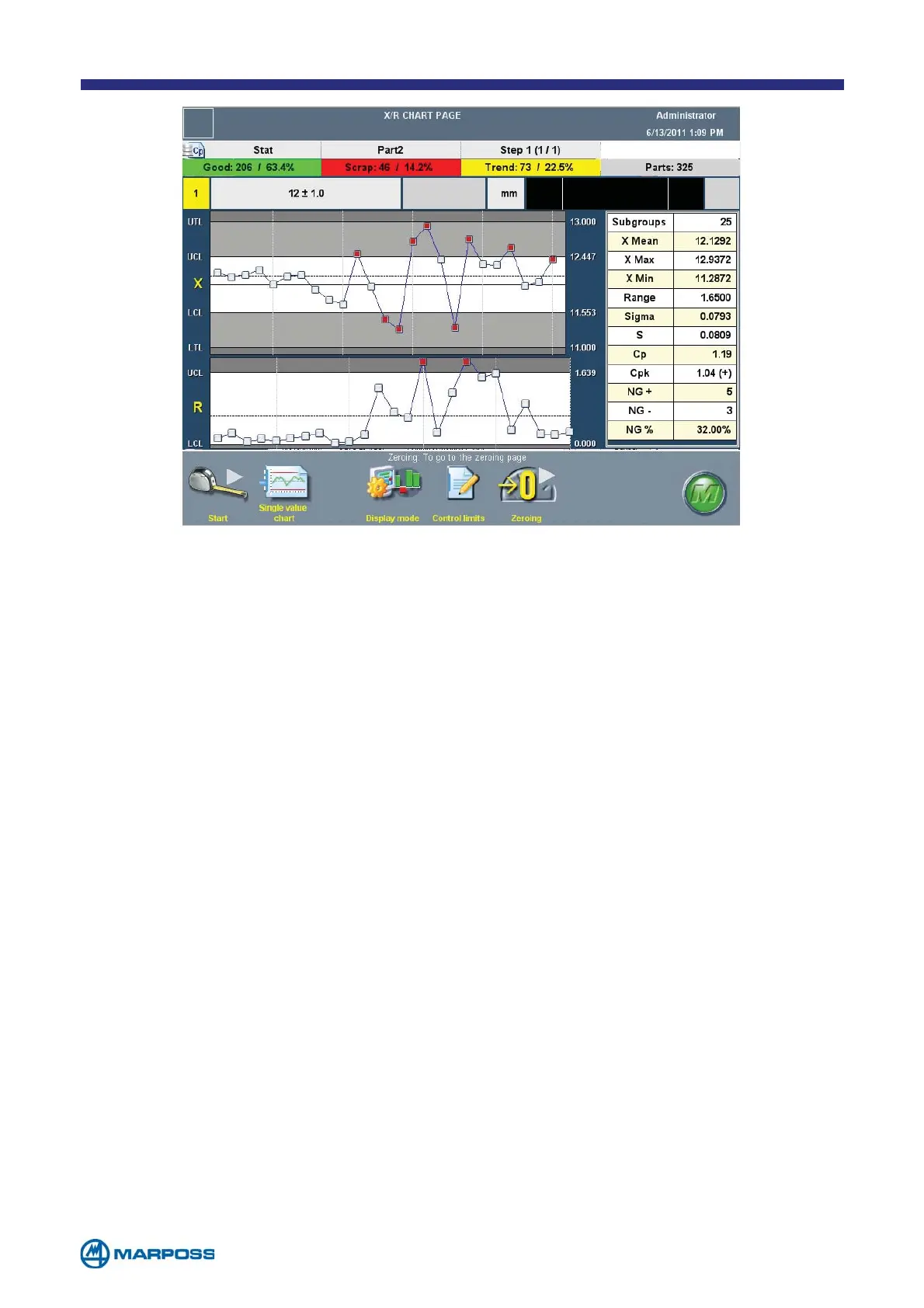 • RUNNING ALARM on XR/S chart (i.e. seven points in a row on one side of the middle