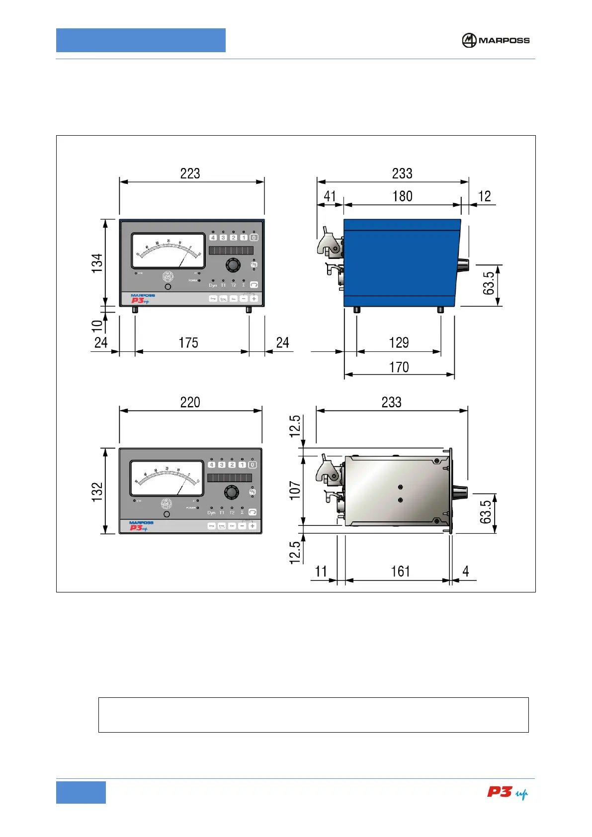 Figure 7: P3UP external dimensions in mm, case and panel-mounted versions