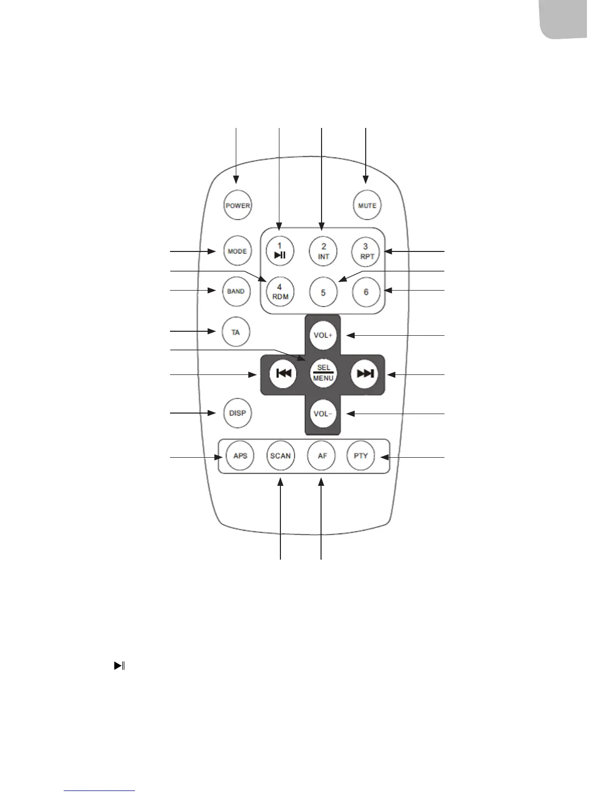 4. INT: I radiomodus: Trykk for forhåndsinnstilt kanal I avspillingsmodus: Trykk for visning av