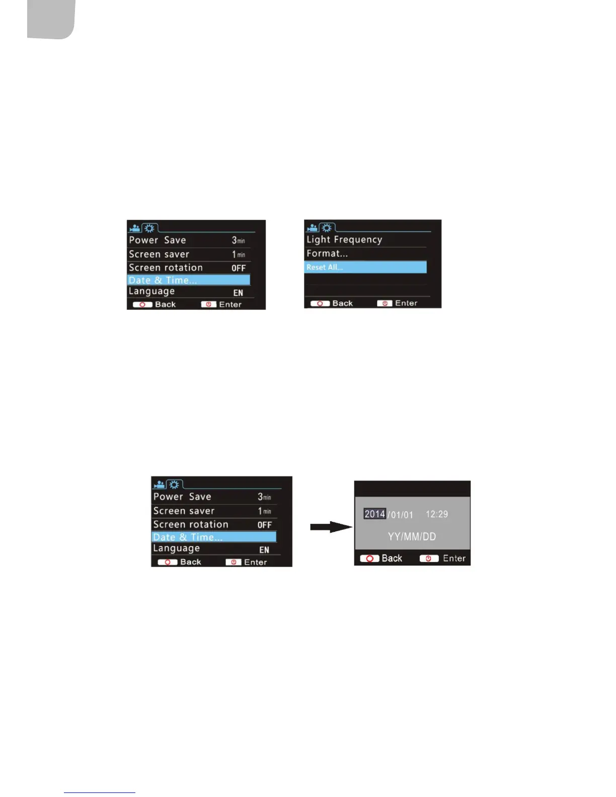 3. Tryck på knappen NER för att markera posten Date and time och tryck på avtryckaren för att