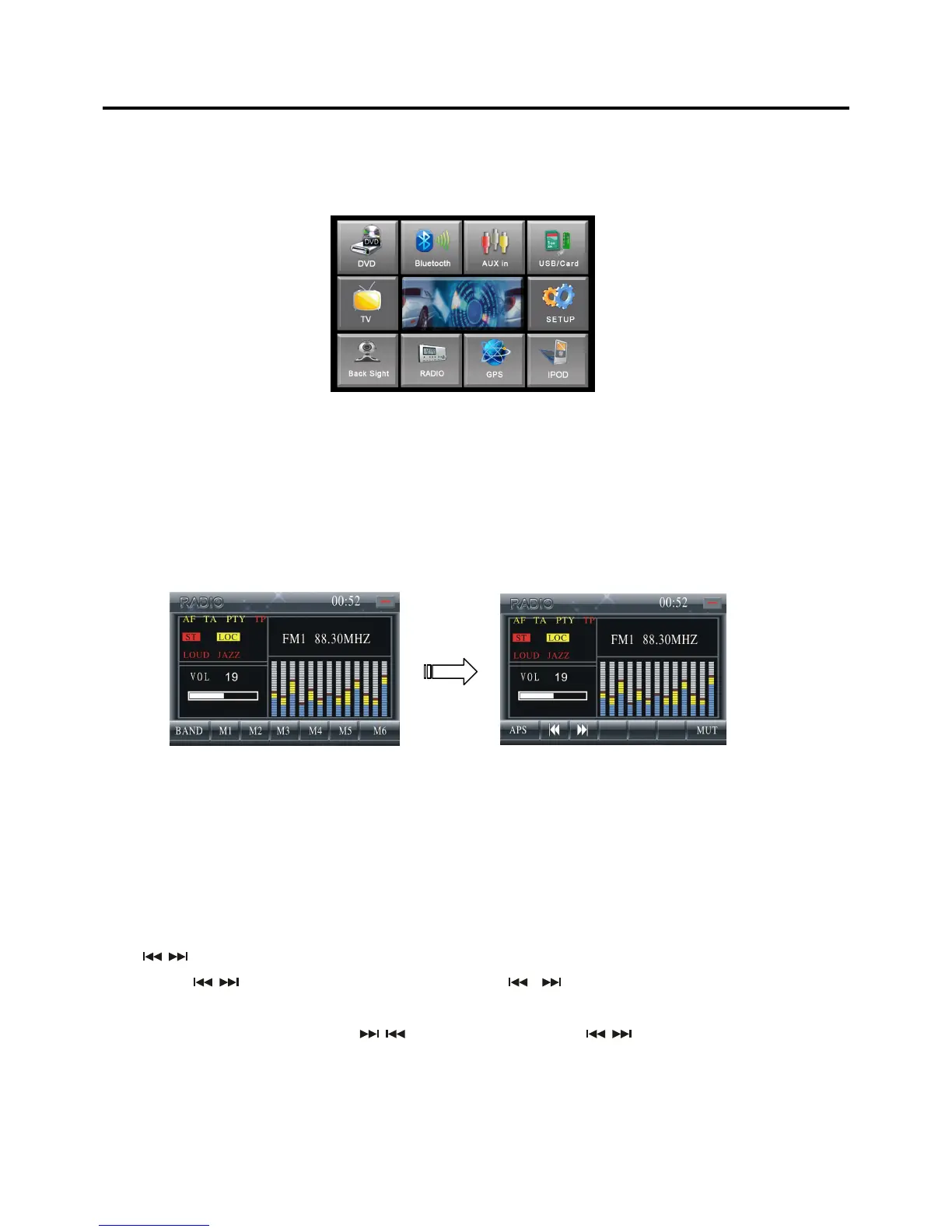 Note: Click some icons will be invalid if the unit doesn’t with the function. For example IPOD function, GPS