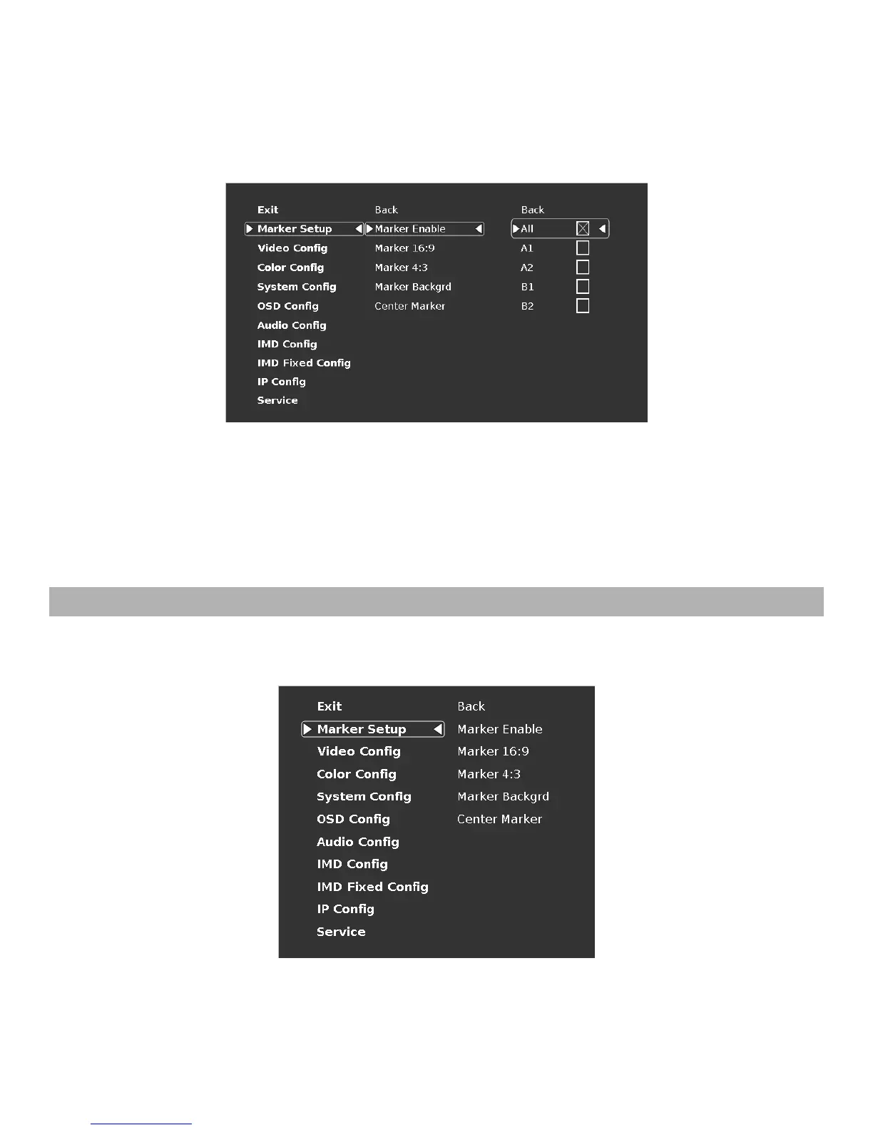 Use the Marker Setup submenu to select various on screen marker options and the opacity of the area surrounding the