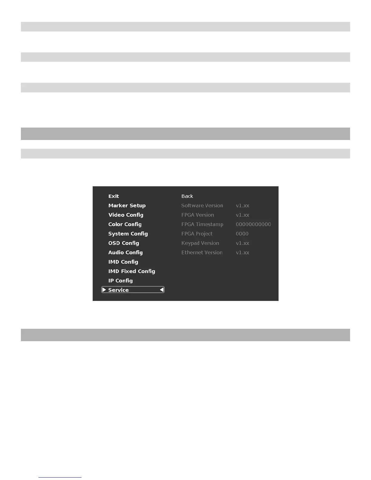 This submenu will give you access to Software versions for each of the key components of the system.