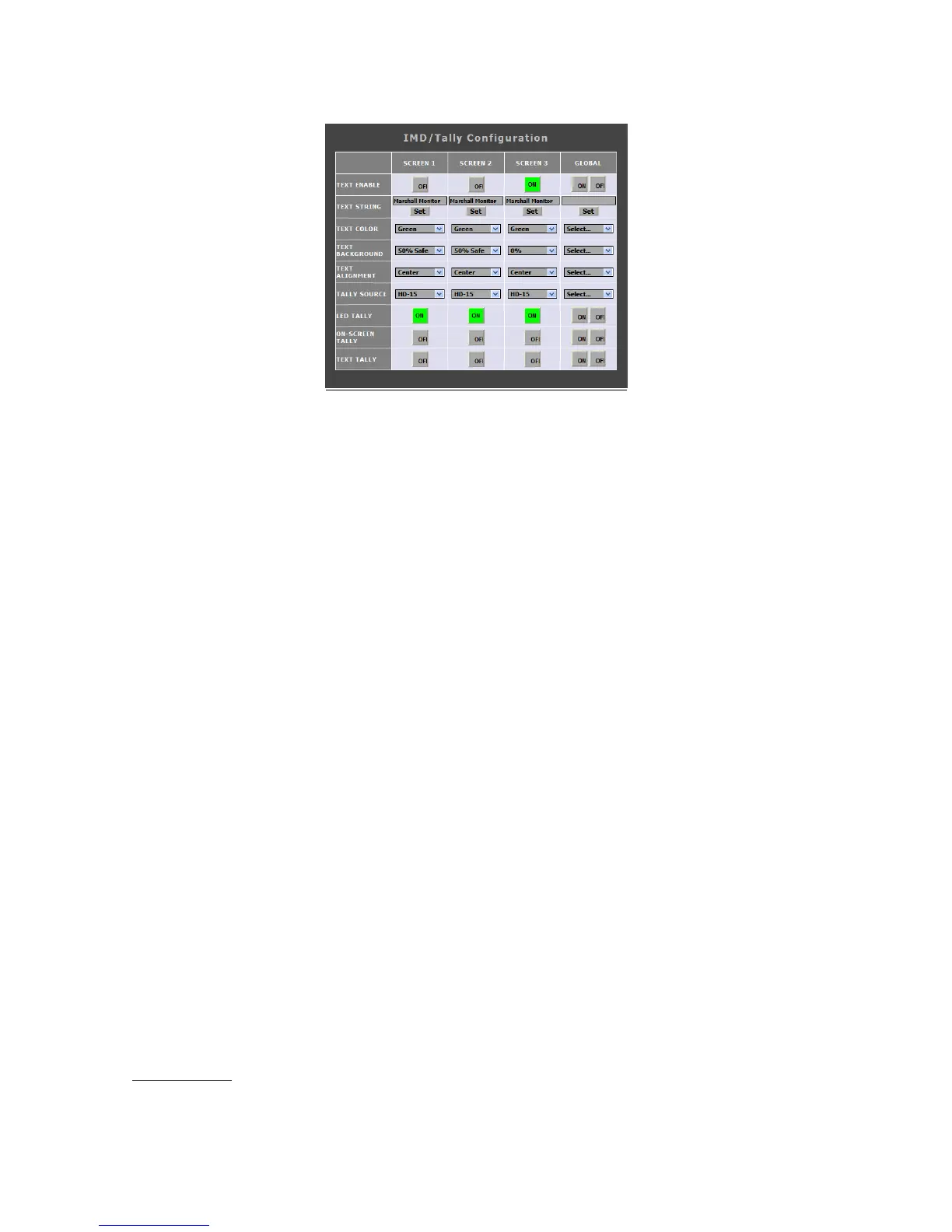 Use this row to turn the monitor’s IMD text ON or OFF. This can also be changed on the global level under the