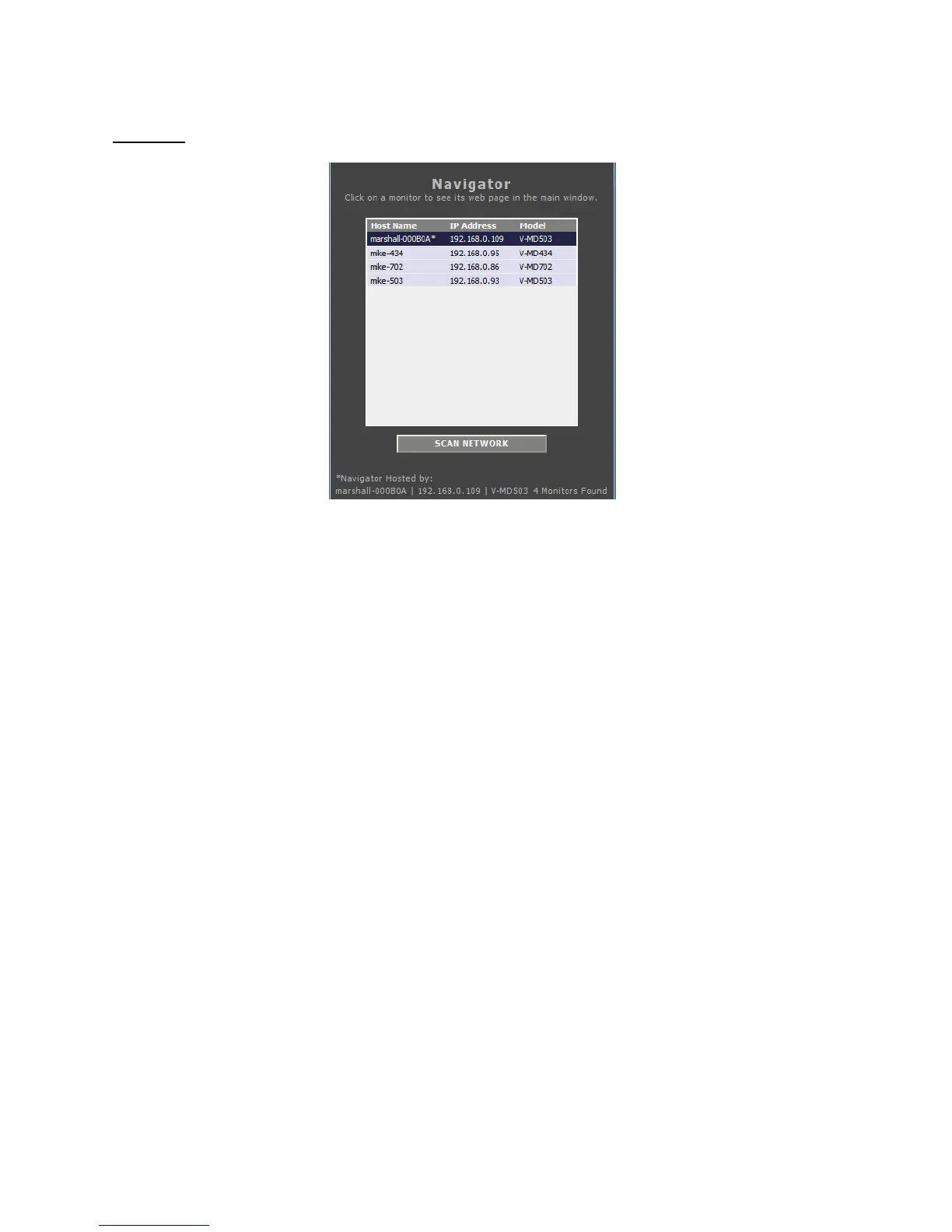 The Network Control page’s Navigator allows you to scan your network for other V-MD702 monitors or any other