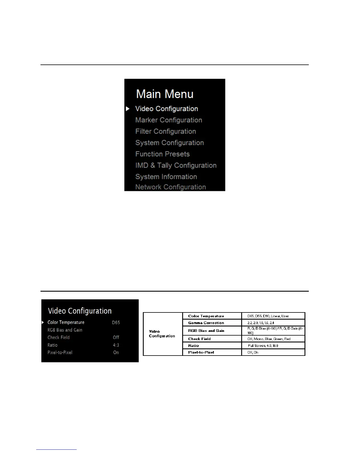 Access the main menu by pushing and holding the MENU button on the front panel of the monitor.