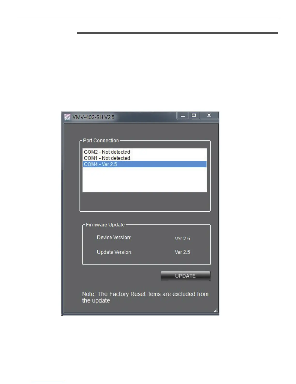 correct COM port and click the UPDATE button to begin the update.