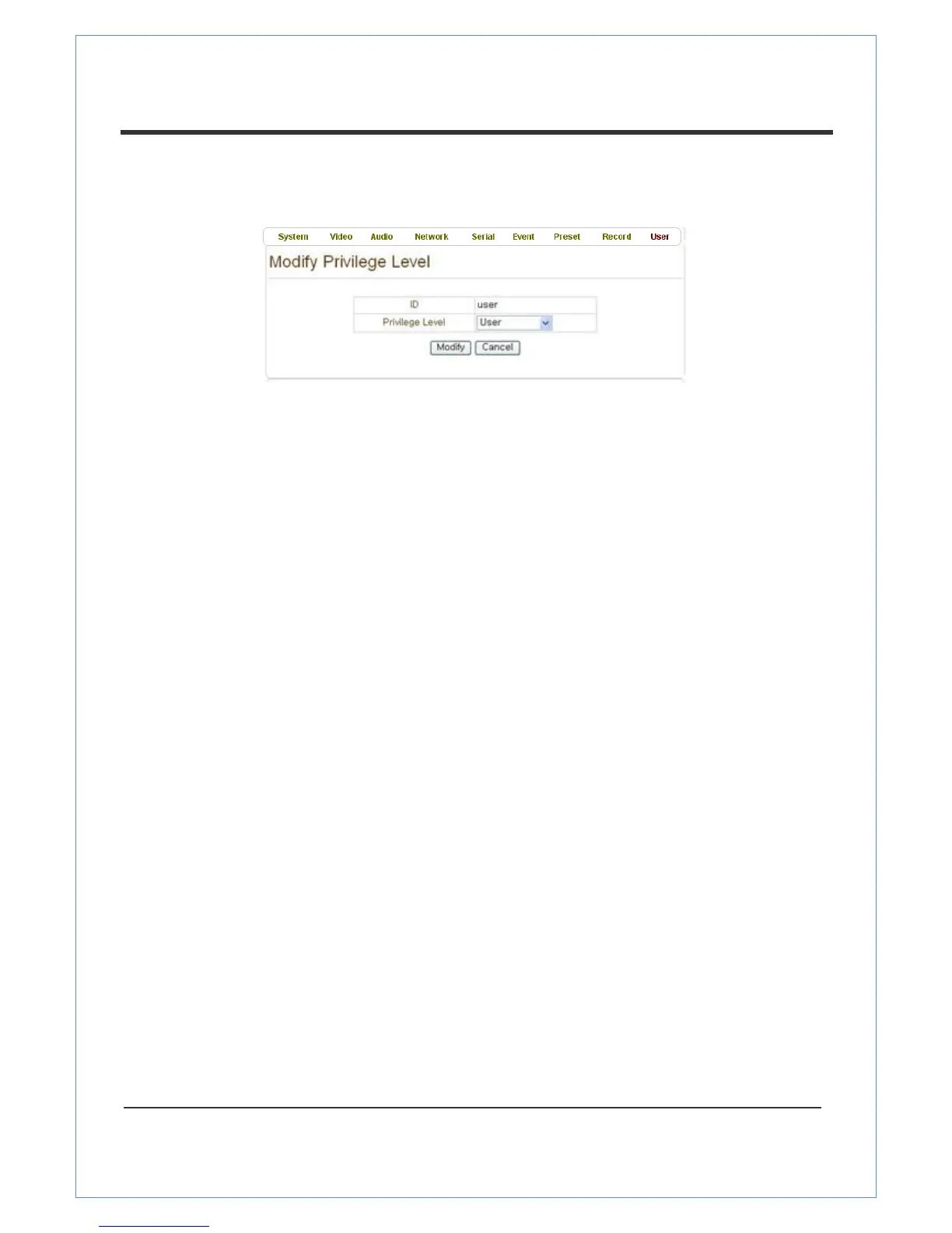 Pressing Modify Privilege button after selecting a user shows a page for changing the