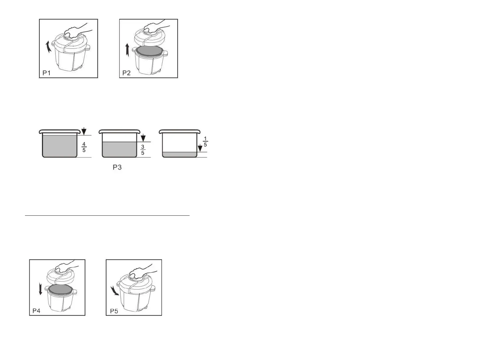 Fill the pot with products and water so the level of products and water is between marks 1/5 and 4/5 (minimum 1/5, maximum 4/5). For products which grow in size a lot (e.g. legumes or cereals)