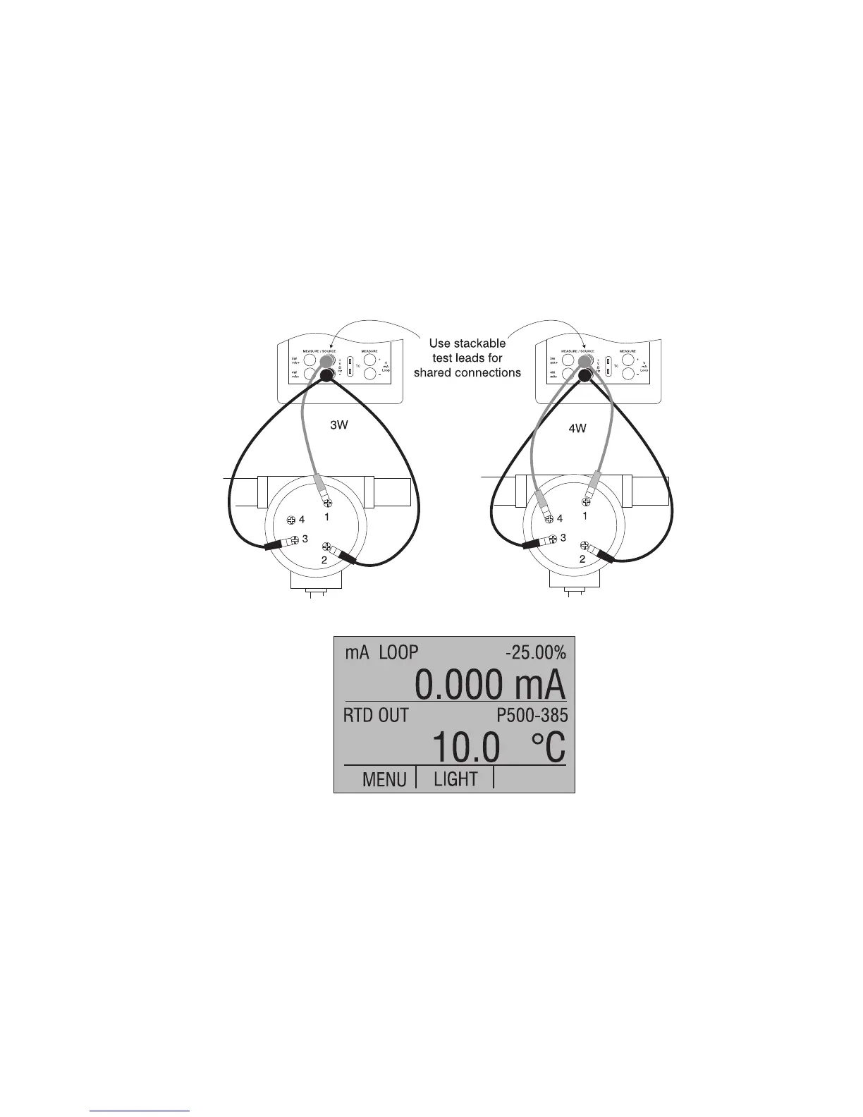 Note: The calibrator simulates a 2-wire RTD. To connect 3- or 4-wire transmitter, use stacking