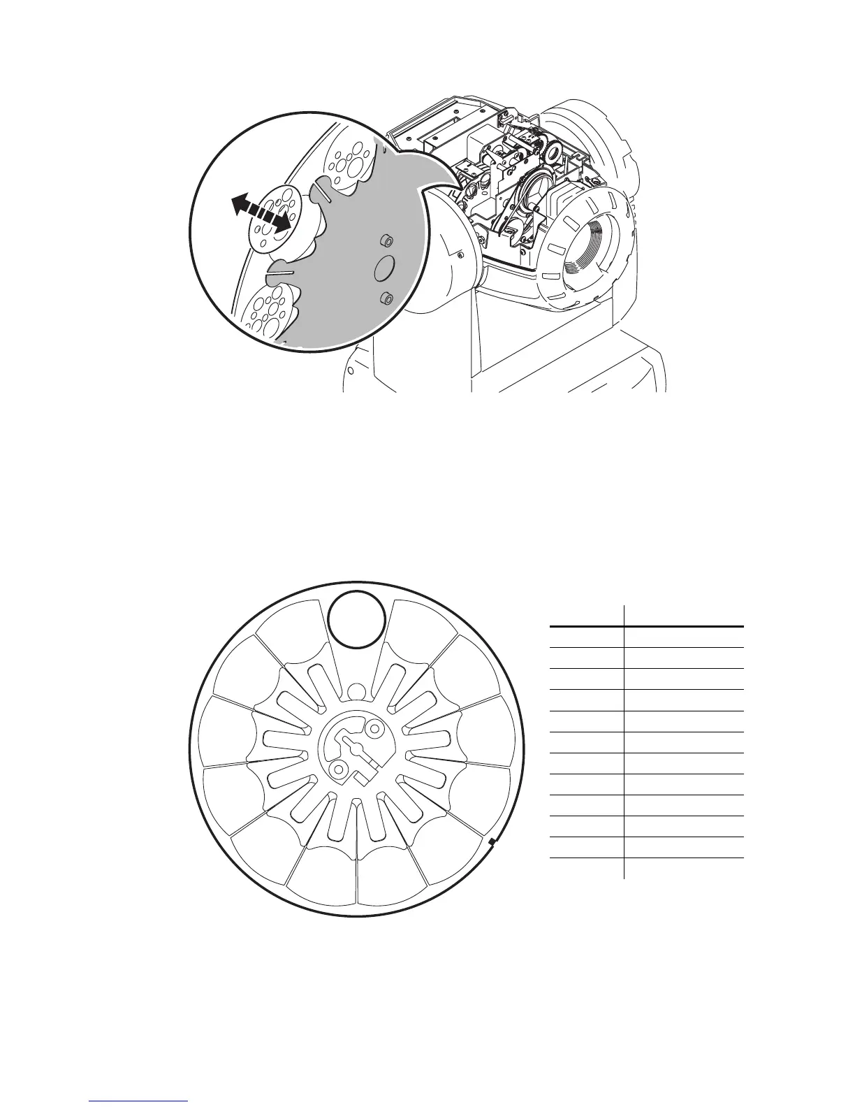 5 Insert the replacement gobo into the holder. Secure the gobo with the retention feather. You may find it