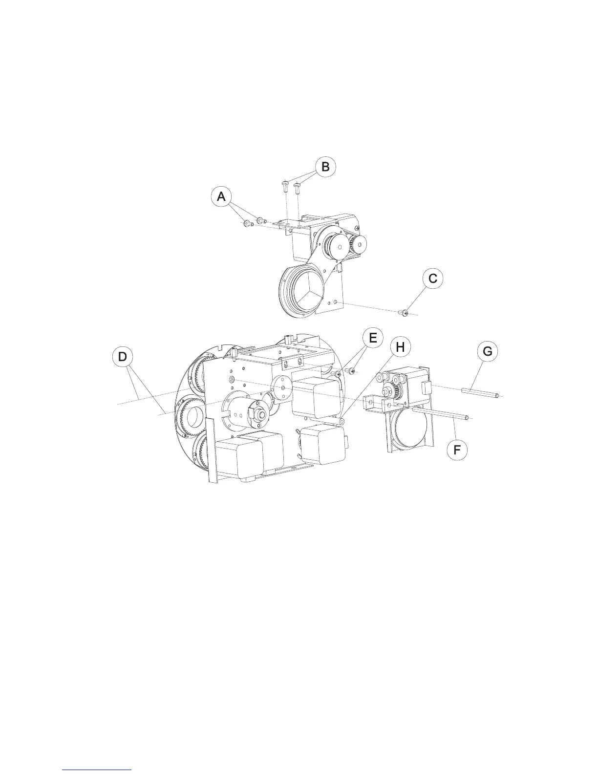 3. Loosen the set screws (D) securing both focus slide pins (F and G). There is only 1 set screw, in the outside