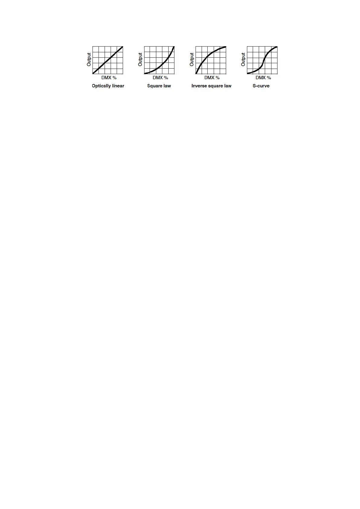 • LINEAR – The increase in light intensity appears to be linear as DMX value is increased.