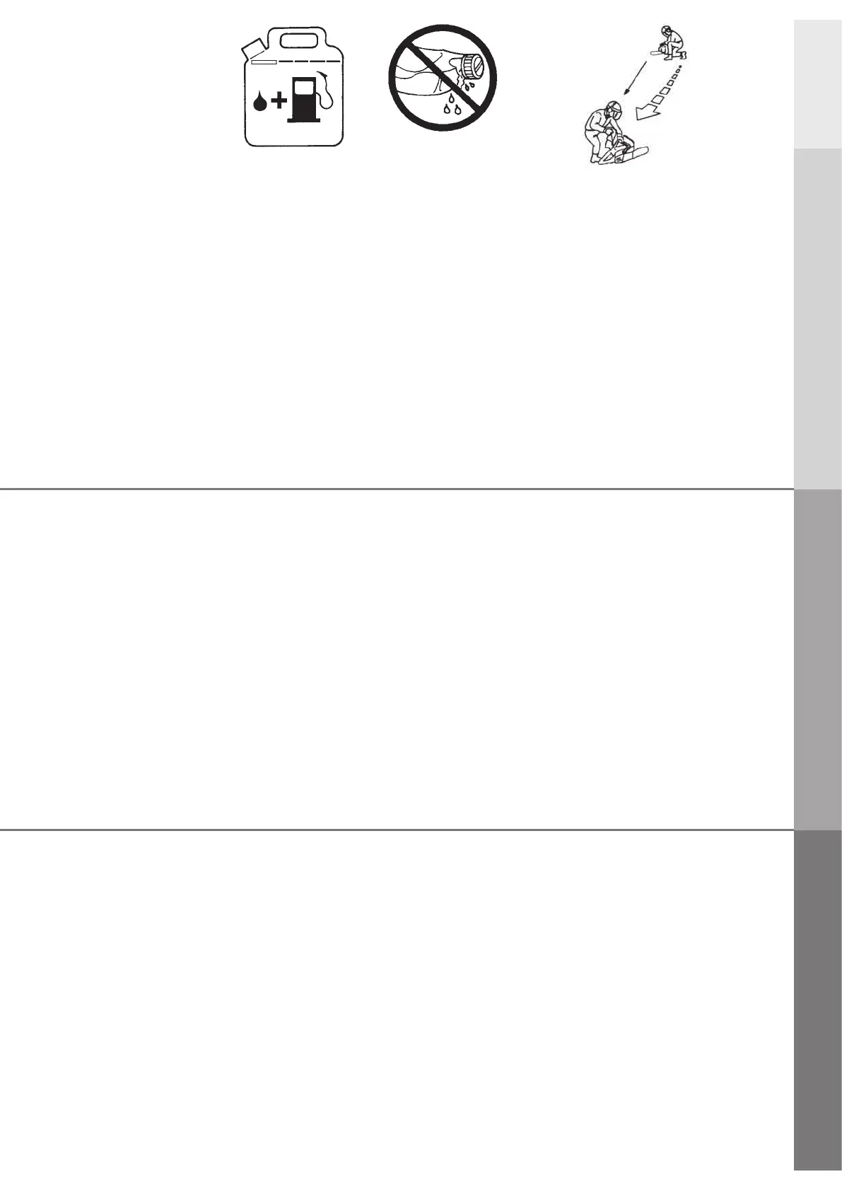 03. Do not smoke near fuel storage containers or the Chain Saw. Do not smoke