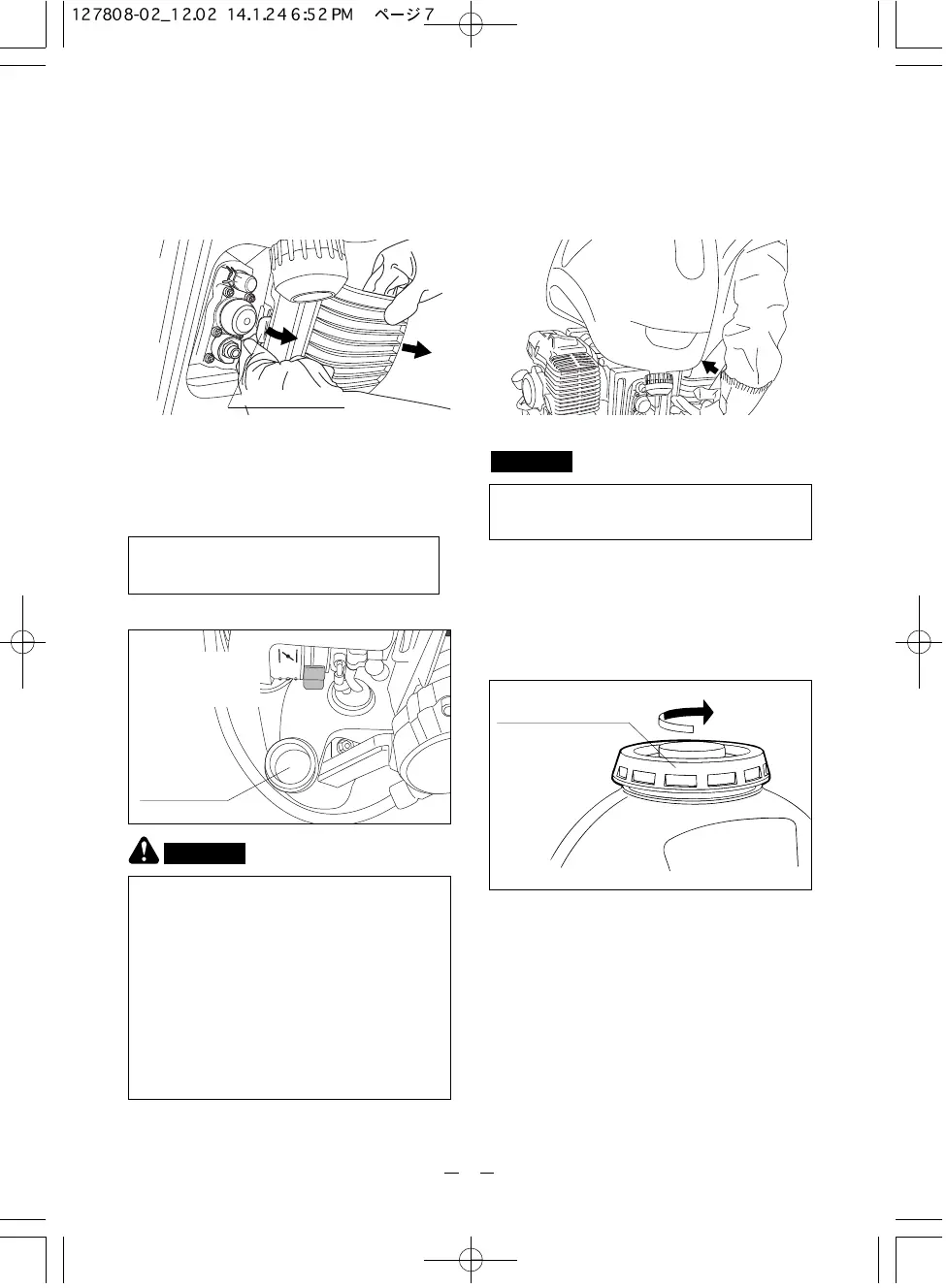 ・Don't spill fuel. If fuel is spilled, wipe it all off