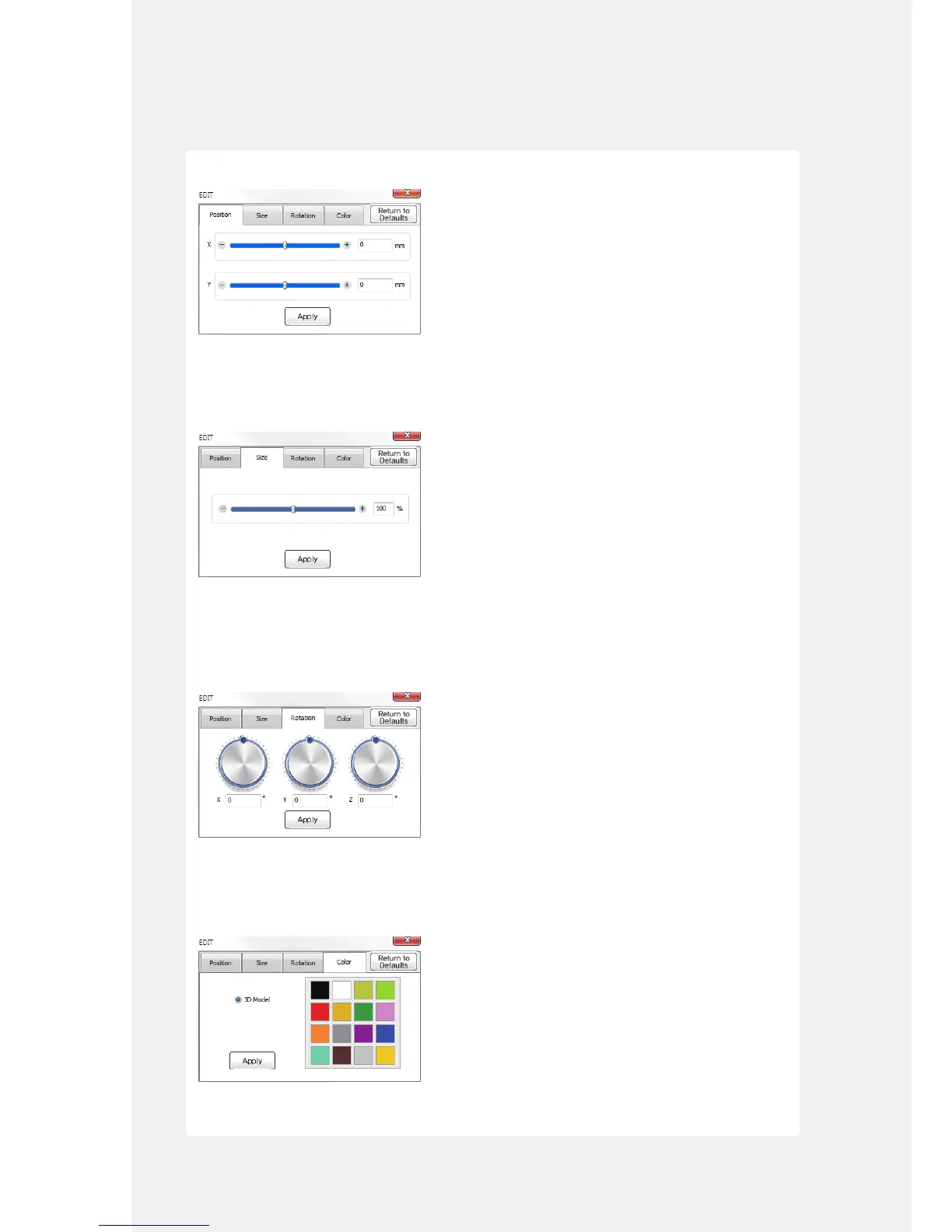 Use this tab to change the color of the 3D object. Click [Apply] to conrm the settings or click [Return