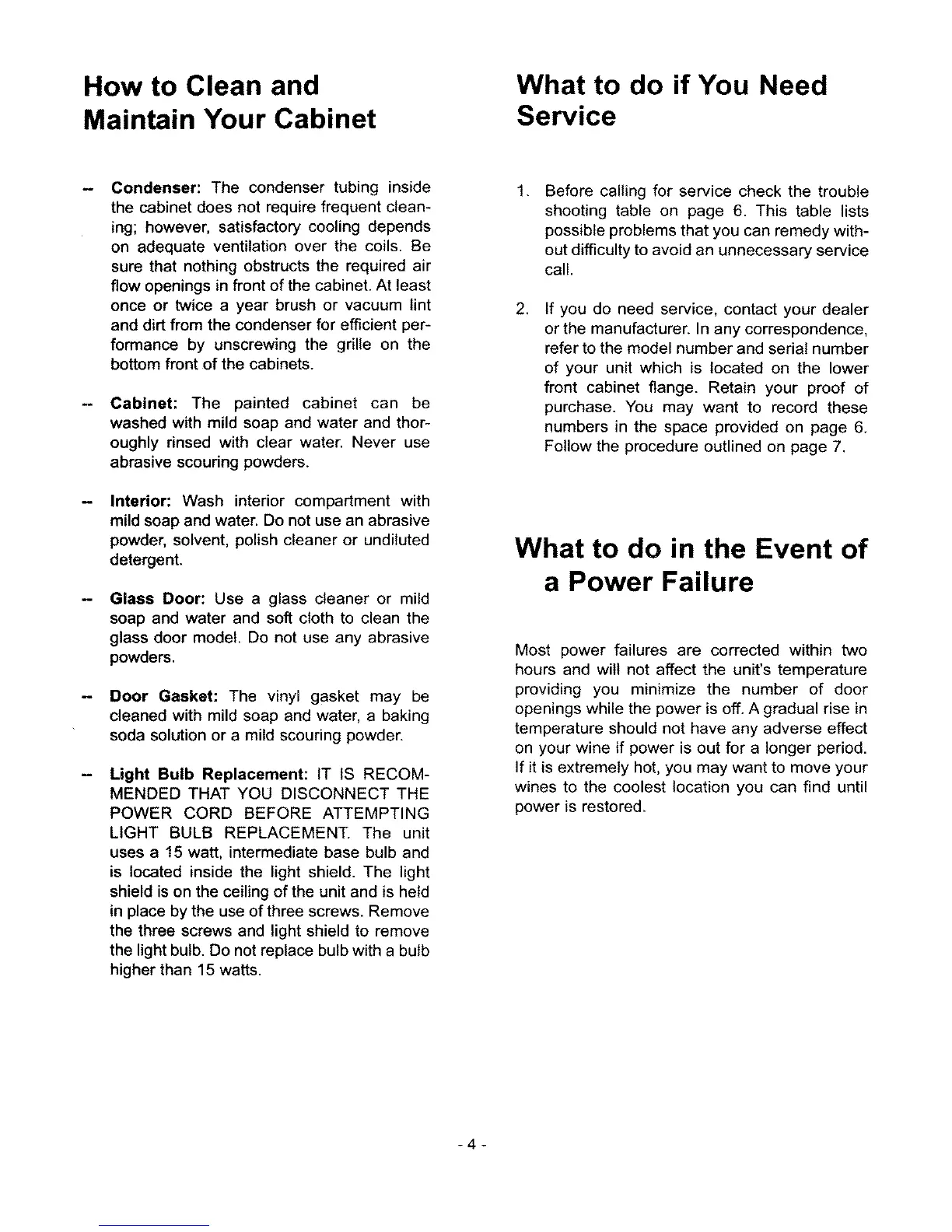 Marvel 61WC-BB-G - Wine Cabinet Cleaning and Maintenance; Condenser and Cabinet Cleaning; Light Bulb Replacement; Service and Support Information
