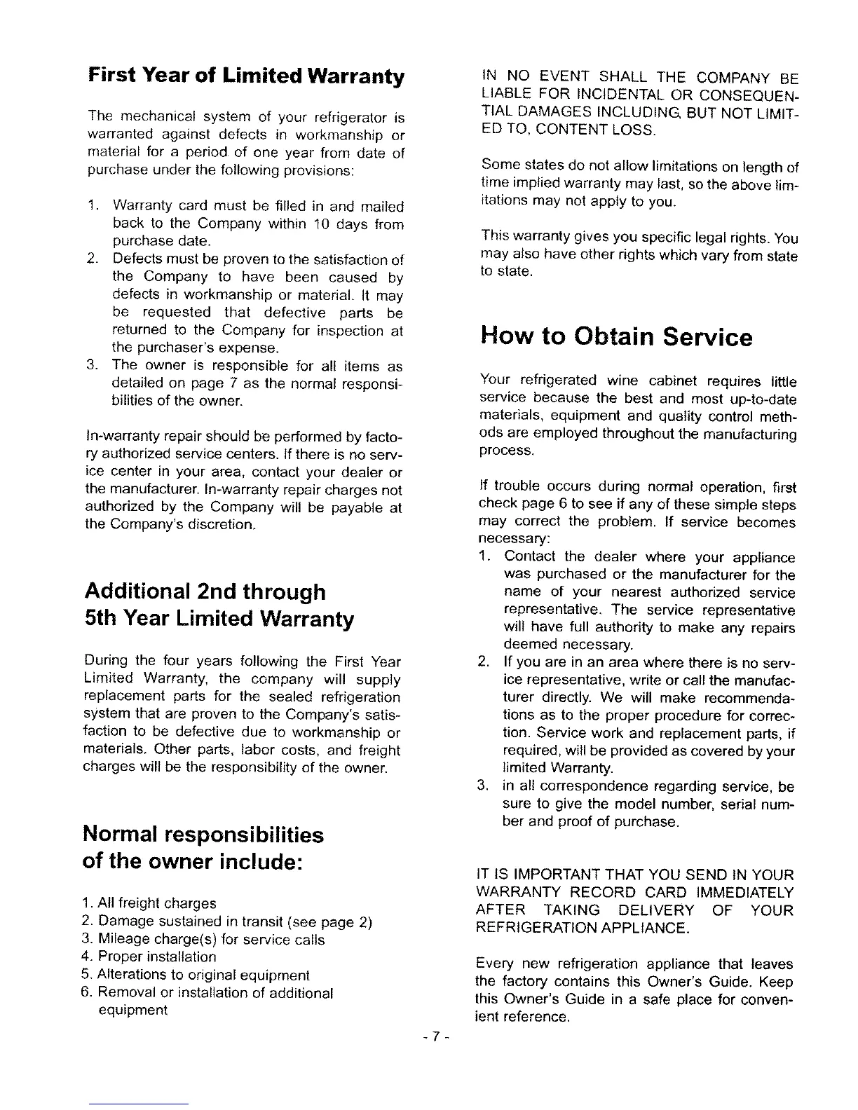 Marvel 61WC-BB-G - First Year Limited Warranty; 2 nd-5 th Year Limited Warranty; Owner Responsibilities and Service; Owners Responsibilities List