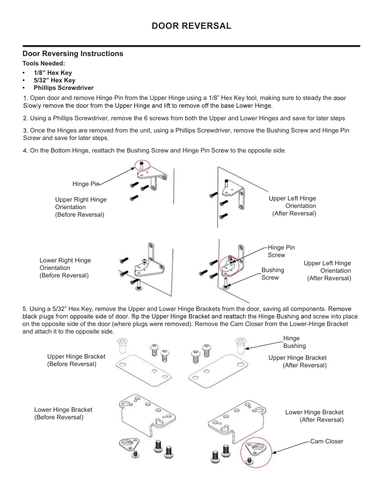 5. Using a 5/32” Hex Key, remove the Upper and Lower Hinge Brackets from the door saving all components.