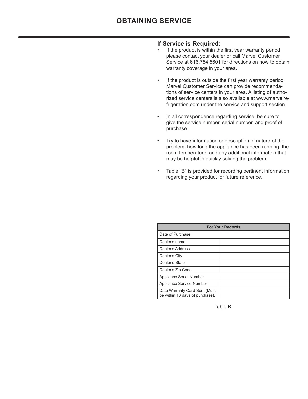 please contact your dealer or call Marvel Customer