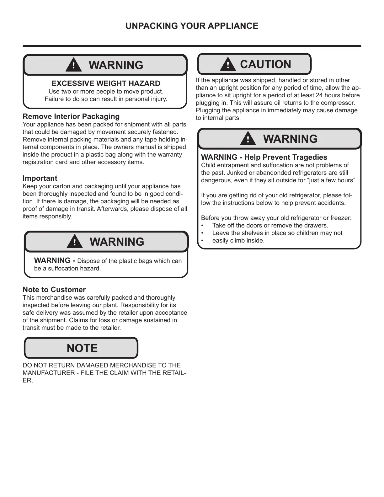 UNPACKING YOUR APPLIANCE