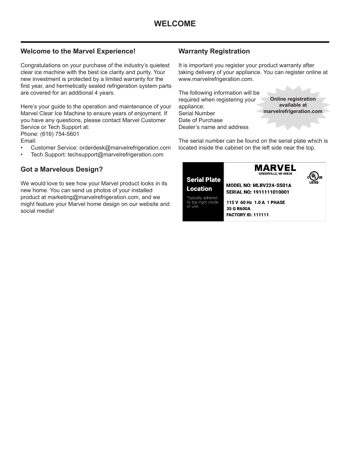 Tech Support: techsupport@marvelrefrigeration.com