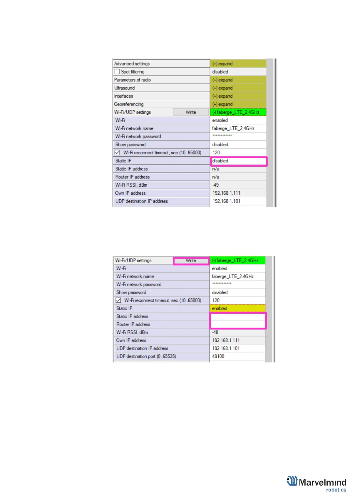 255.) and IP address of router that using for Wi-Fi connection. Press Write