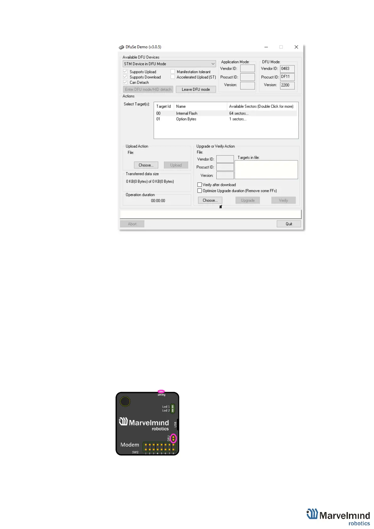6.3.11.22. Modem will go to DFU mode. Press UPGRADE button in the DfuSe