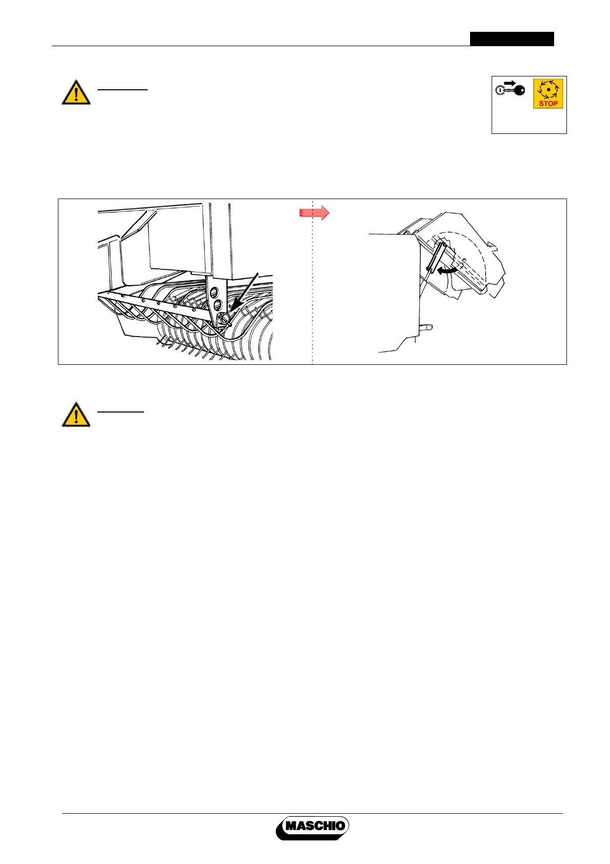 1) Remove the pins "S" that secure the rake in order to remove the forage obstructing the front part.