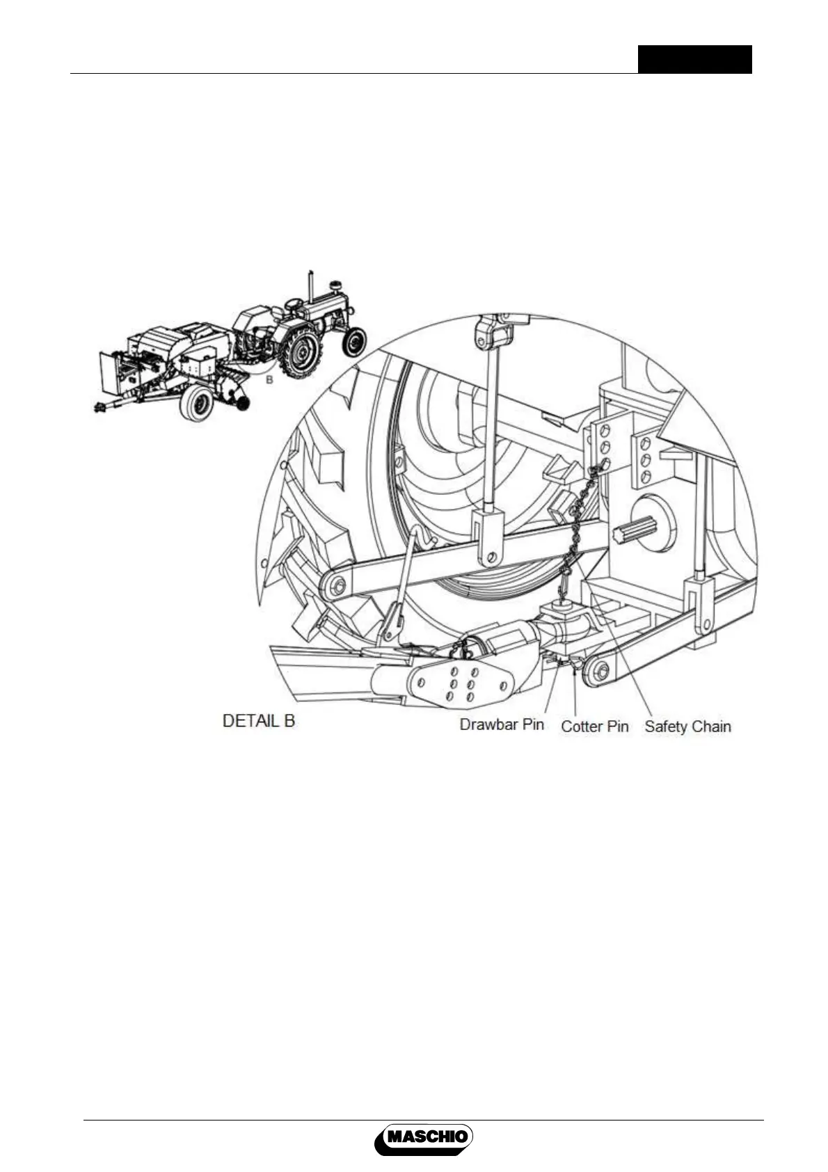 approaching to the baler. Align the strut with baler drawbar and install drawbar pin. Use