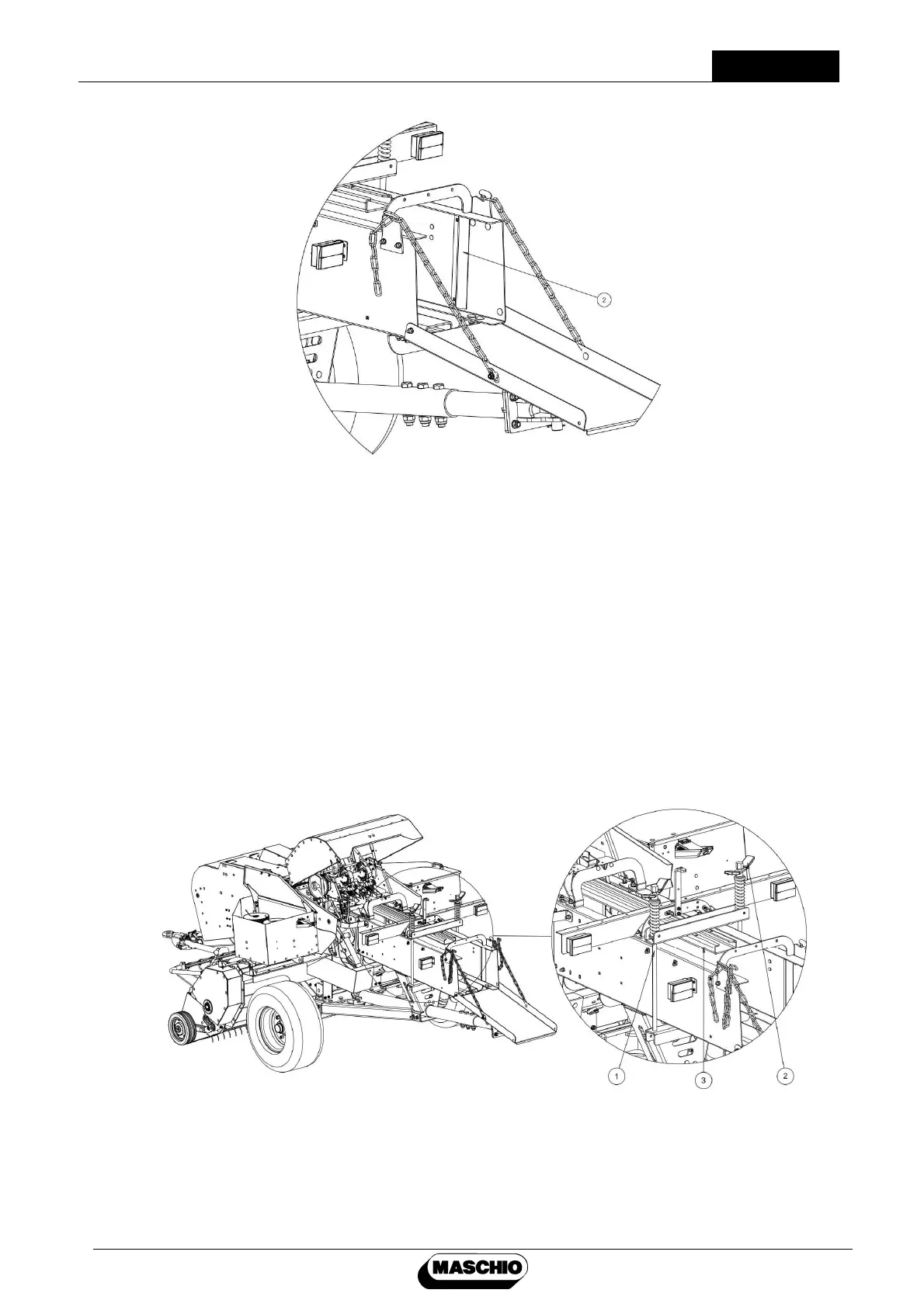 pivots) (1) located in rear part of the tail. You can adjust bale density and weight by turning