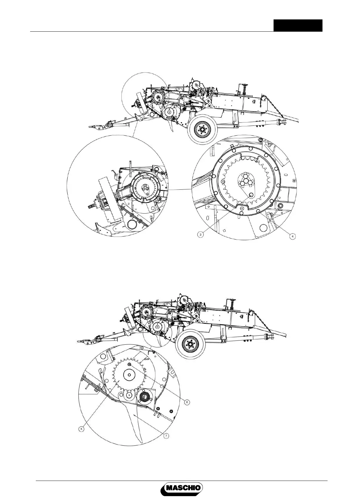 • Align M6X35 knotter set shear bolt (6) located on hayfork group drive chain gear (5)