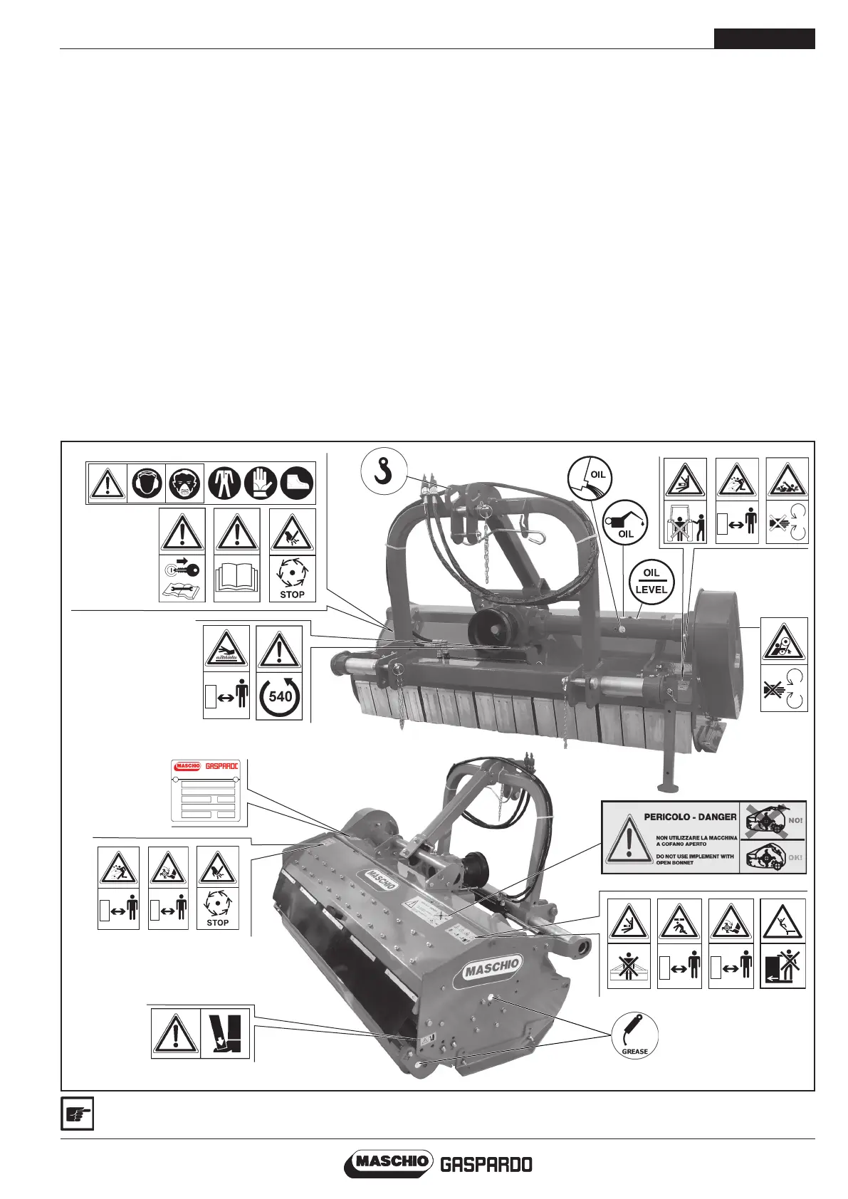 5) Danger of getting hooked by the Cardan shaft. Keep away