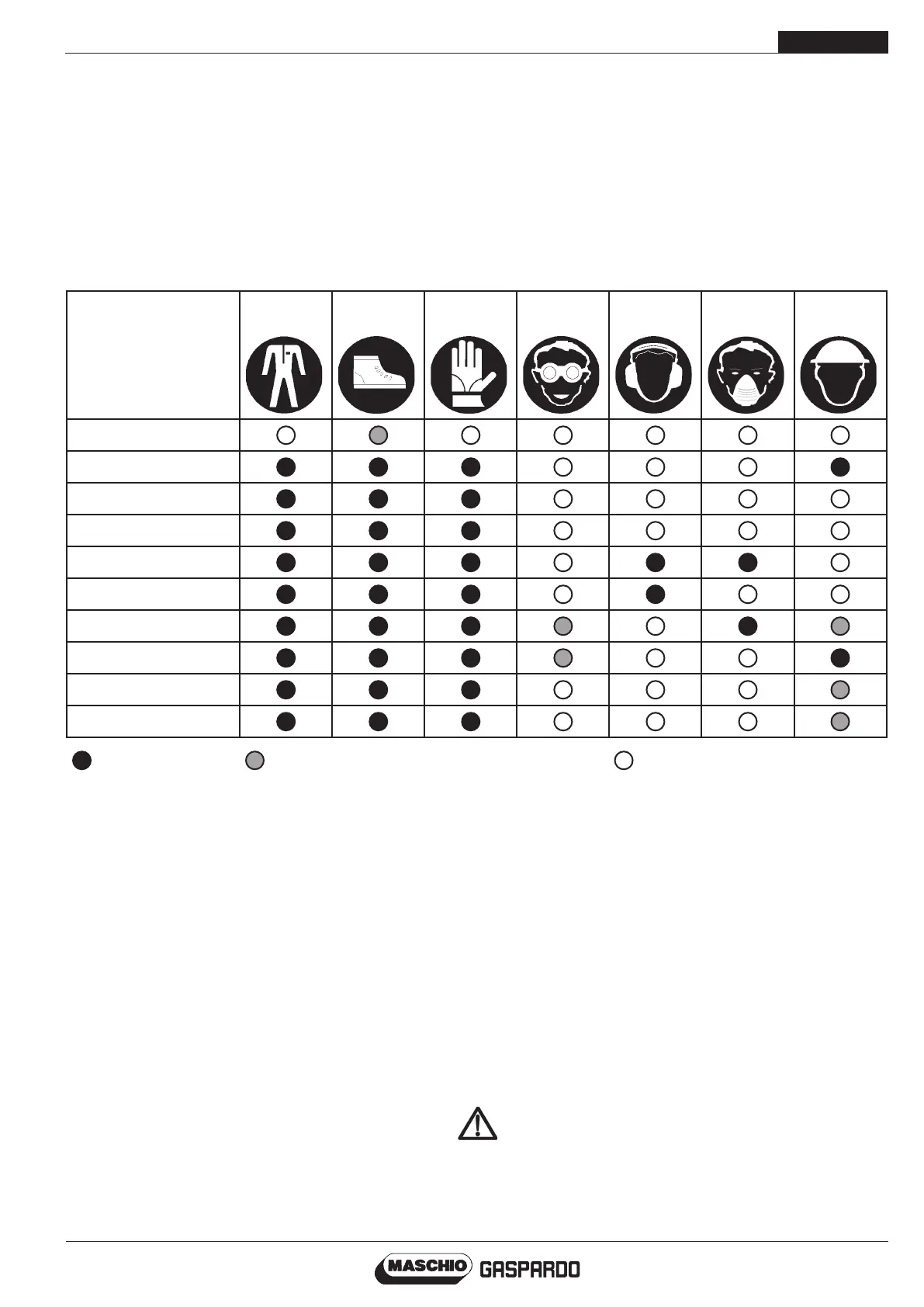 Table 1 summarises the PPE (Personal Protection Equipment) to be used during the different phases of machine life (each