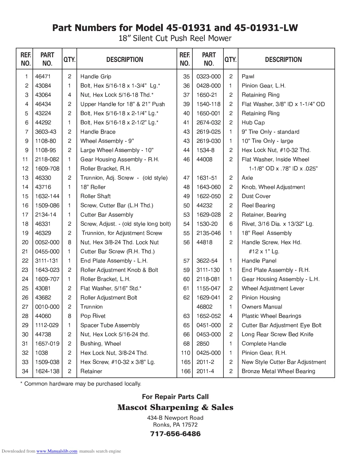 MASCOT 45-01931 - Part Numbers and Descriptions