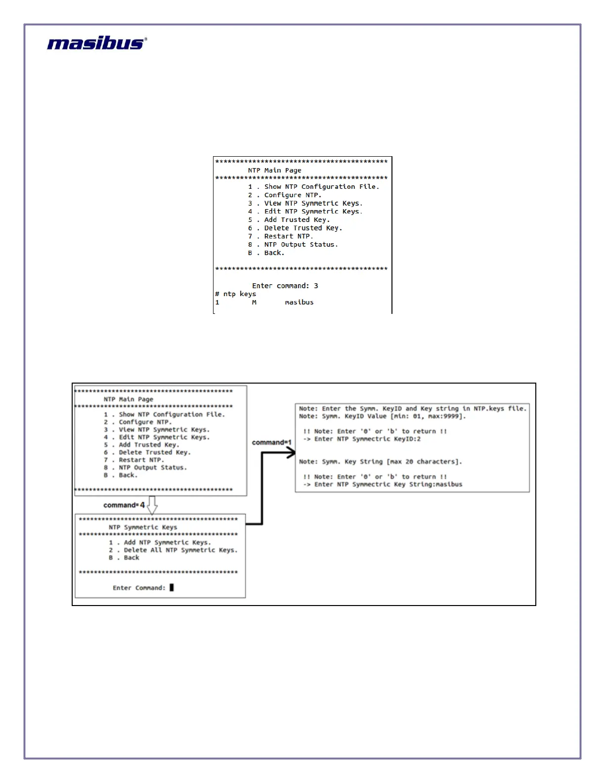 Symmetric key id and string can be entered using the option “4” in NTP main menu. User can also view