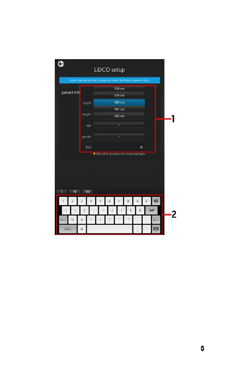 2. LiDCO menu opens. Manually enter patient info in the fields of the LiDCO setup menu (1).