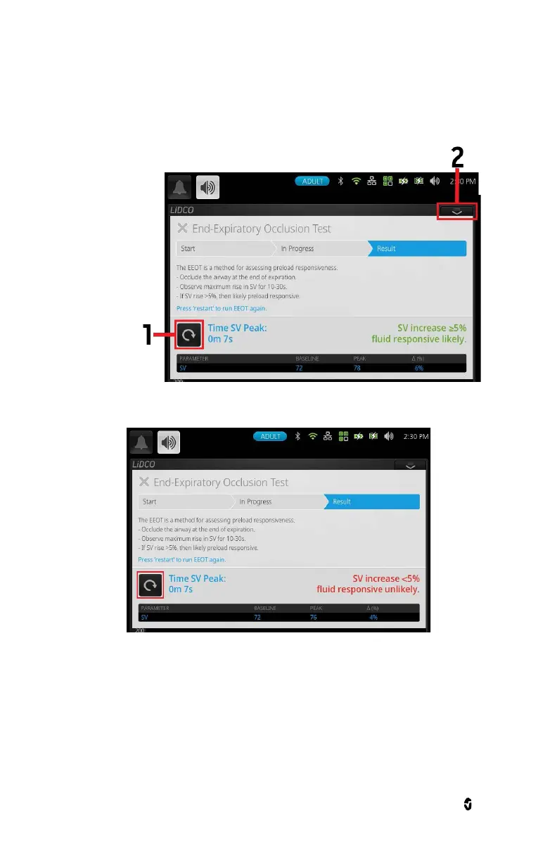4. A positive result is indicated by green text. Once protocol is complete, a restart button (1)